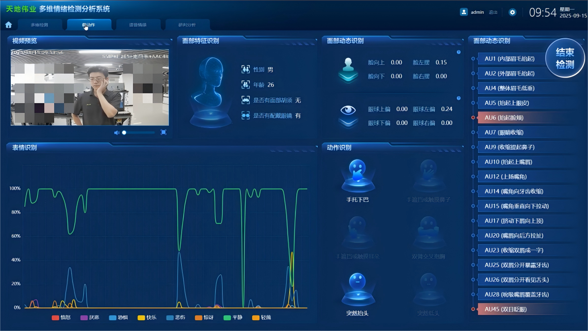 細(xì)微的肢體動作往往是心理狀態(tài)的“晴雨表”,但傳統(tǒng)監(jiān)測難以捕捉。系統(tǒng)通過AI算法精準(zhǔn)識別32種微動,包括:頭部運動(向上、向下、左擺、右擺)、眼部運動(眼球左/右/上/下偏),典型動作(手遮擋/觸摸鼻子/耳朵、雙臂交叉抱胸、突然抬頭/低頭、手托下巴),18種AU面部動作單元(如內(nèi)部眉毛抬起、上眼皮抬起、嘴角上揚、嘴唇收縮等)。