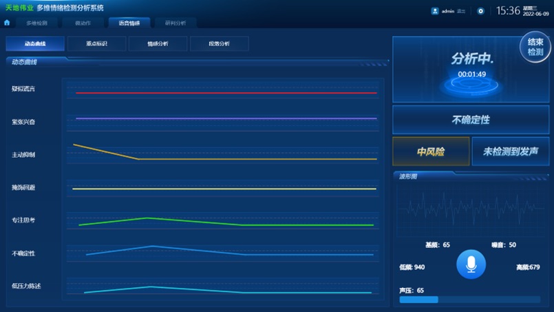 天地偉業(yè)多維情感檢測分析系統(tǒng)并非四大功能的簡單疊加,而是通過心理狀態(tài)與壓力值綜合分析,實現(xiàn)“1+1>2”的研判效果,可更精準(zhǔn)判斷對象處于“抗拒+高壓力”狀態(tài),為工作人員提供明確的研判方向,為留置、監(jiān)管、看護(hù)等場景提供了更精準(zhǔn)、更智能的監(jiān)測方案。
